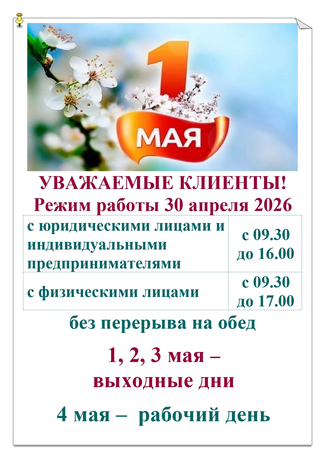 Режим работы 30 апреля. 1, 2, 3 мая 2026г.